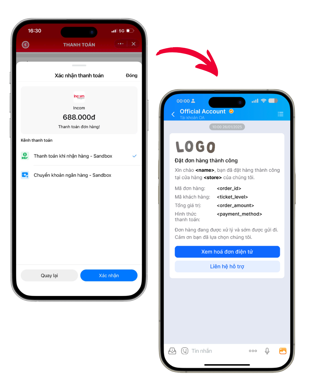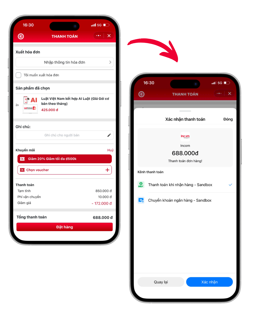 Tối ưu trải nghiệm chốt đơn với quy trình thanh toán mượt mà và tiện lợi: dễ dàng chọn hoặc thêm địa chỉ nhận hàng, áp dụng voucher giảm giá, lựa chọn phương thức thanh toán phù hợp, thanh toán nhanh qua SDK tích hợp và nhận thông báo xác nhận đơn hàng tức thì.