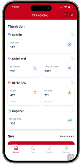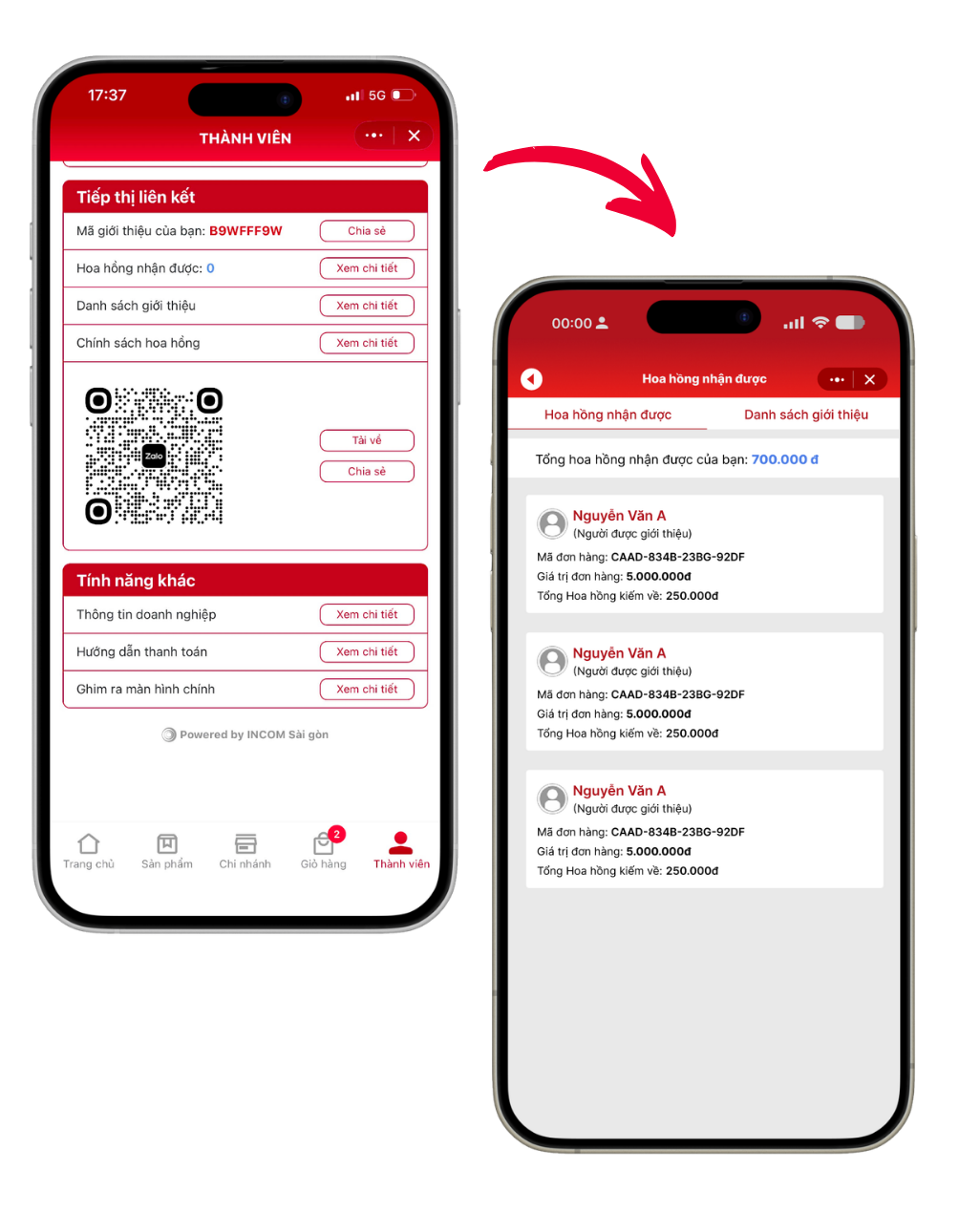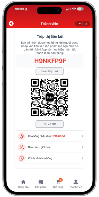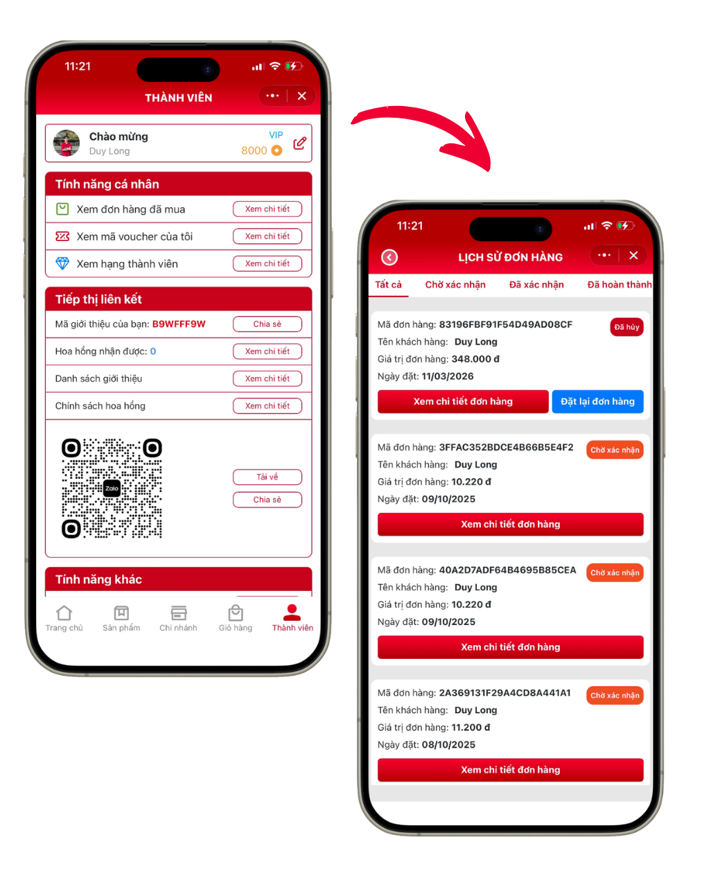 Biến mỗi lượt chia sẻ thành cơ hội tăng thu nhập với tính năng tiếp thị liên kết toàn diện: cung cấp mã, link và QR giới thiệu cá nhân để chia sẻ nhanh, theo dõi hoa hồng minh bạch theo từng đơn hàng, quản lý danh sách khách giới thiệu và nắm rõ chính sách thưởng dễ dàng.