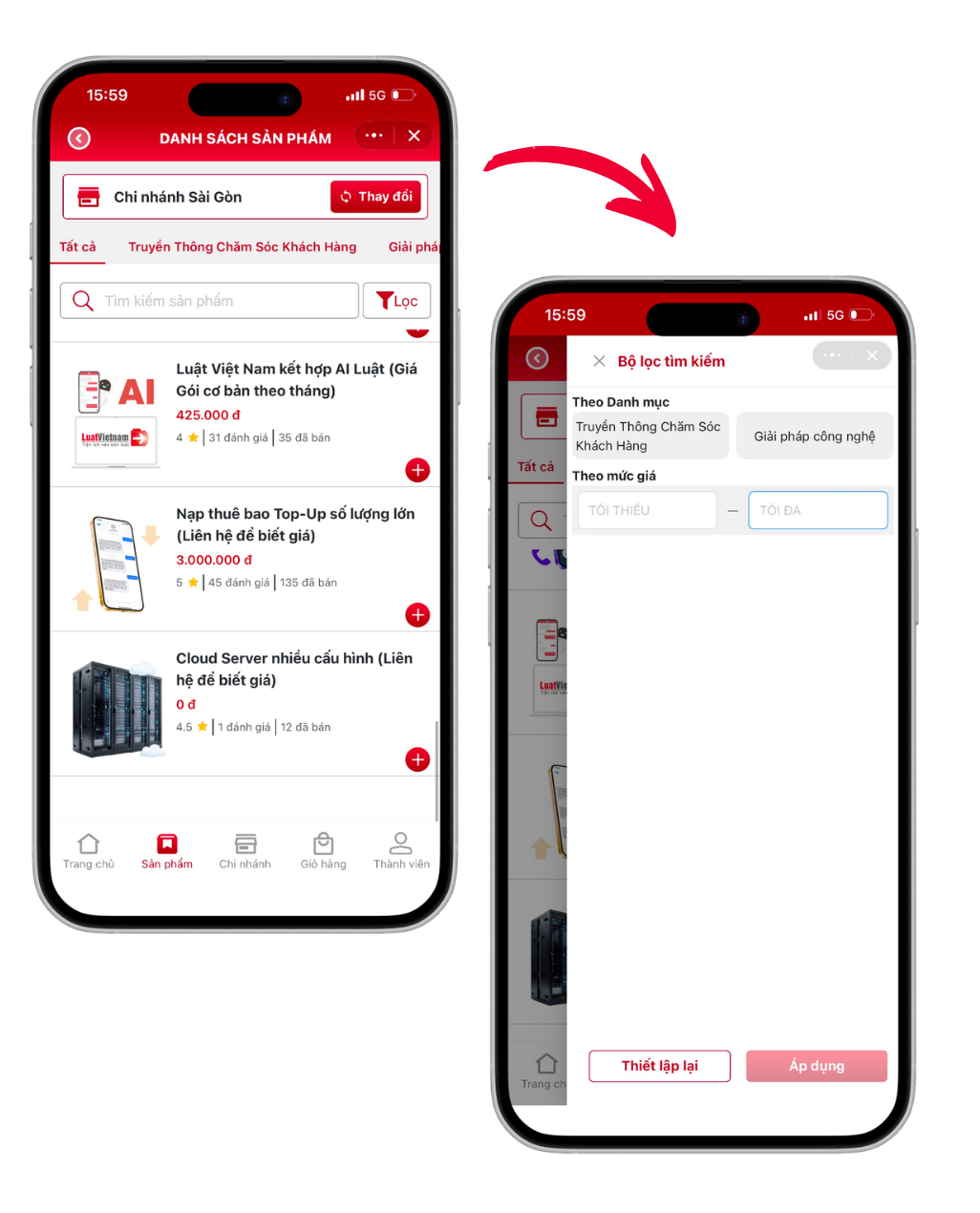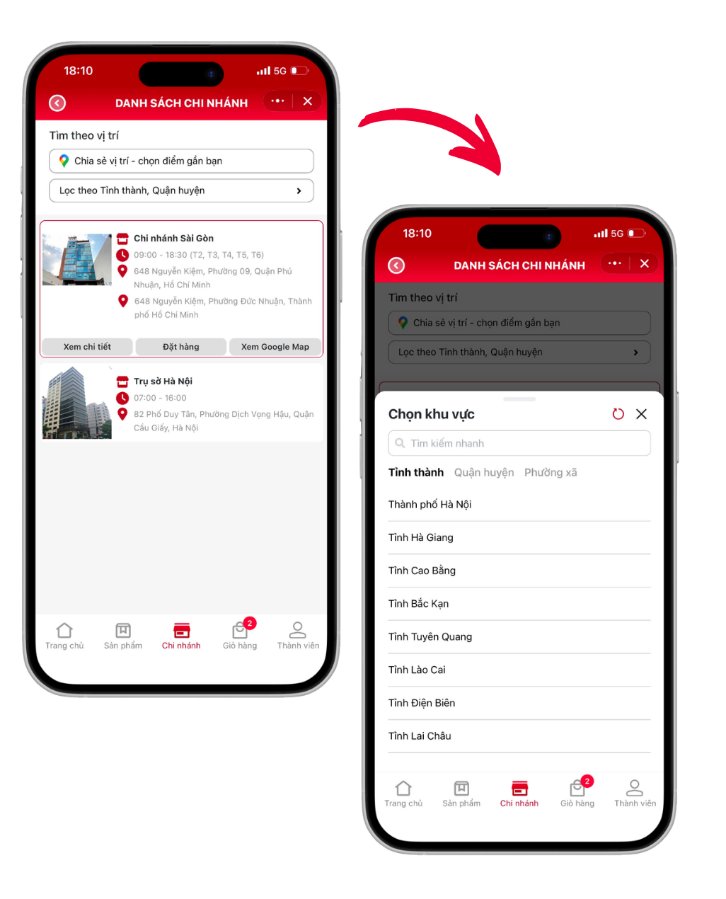 Giúp người dùng kết nối với cửa hàng gần nhất thật thuận tiện bằng tính năng chi nhánh thông minh: tự động gợi ý theo vị trí, xem trạng thái mở cửa, địa chỉ và mô tả chi tiết, tìm kiếm trên bản đồ theo khu vực và dễ dàng chọn chi nhánh phù hợp để mua sắm.