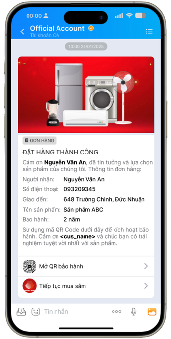 Tính năng Gửi tin tự động giúp doanh nghiệp bán lẻ chăm sóc khách hàng 24/7 theo từng hành vi thực tế như xác nhận đơn, hướng dẫn sử dụng, nhắc giỏ hàng, nhắc mua lại và ưu đãi sinh nhật. Nội dung được cá nhân hóa theo tên, sản phẩm, hạng thành viên, giúp tăng tương tác, kích thích mua lại và giảm tải vận hành thủ công.