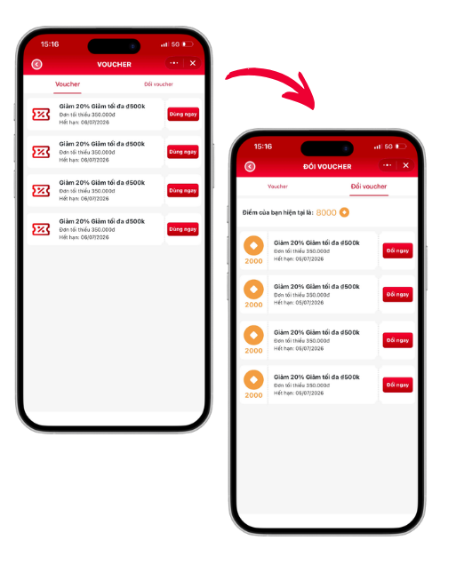 Biến mỗi lần tương tác thành giá trị với tính năng Voucher tiện lợi: dễ dàng lưu trữ toàn bộ ưu đãi trong kho cá nhân, đổi voucher nhanh bằng điểm thành viên hoặc nhập mã, sẵn sàng sử dụng cho những lần mua sắm tiếp theo.