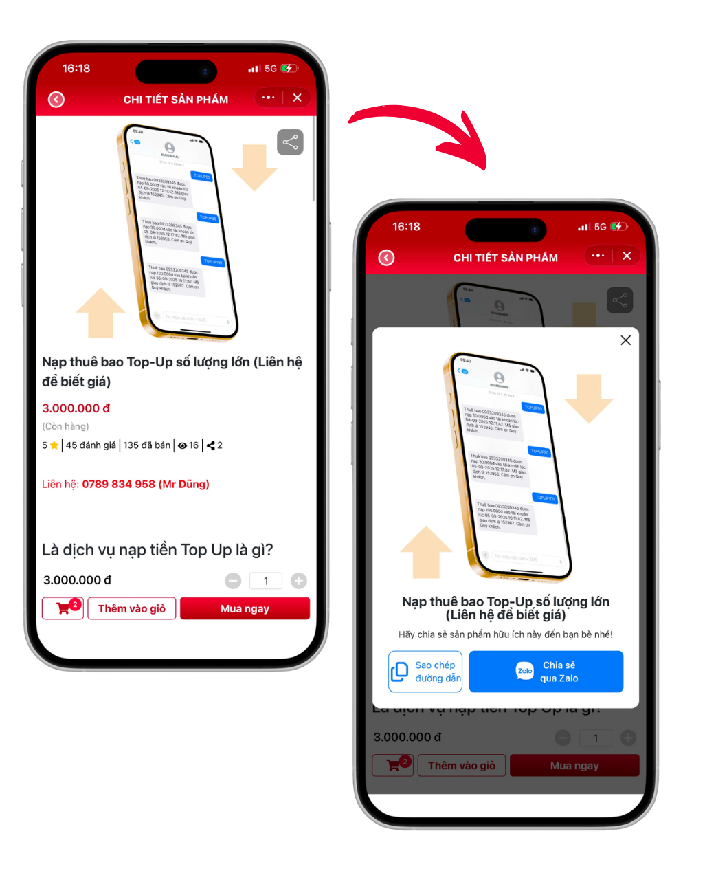 Mang đến trải nghiệm mua sắm cuốn hút với trang chi tiết sản phẩm đầy đủ và trực quan: từ tên, giá gốc – giá giảm, % ưu đãi, lượt bán, đánh giá, tồn kho đến chọn phân loại, ghi chú đơn hàng, chia sẻ nhanh, gợi ý sản phẩm liên quan và kết nối chat OA để được tư vấn tức thì.