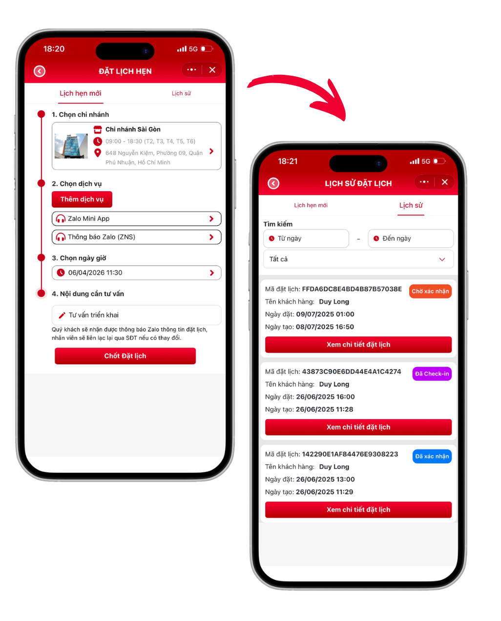 Mang đến trải nghiệm đặt lịch nhanh chóng và chuyên nghiệp: dễ dàng chọn chi nhánh gần nhất theo khoảng cách hoặc bản đồ, chọn dịch vụ, ngày giờ phù hợp, thêm ghi chú chi tiết và theo dõi toàn bộ lịch sử đặt hẹn cùng trạng thái xử lý rõ ràng ngay trên Mini App.