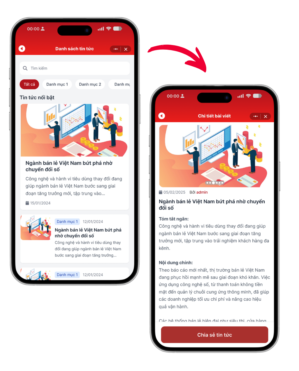 Khám phá tin tức thật nhanh với tính năng tìm kiếm thông minh, lọc theo danh mục yêu thích, đọc chi tiết dễ dàng và chia sẻ bài viết chỉ trong một chạm qua link hoặc Zalo, giúp nội dung lan tỏa thú vị hơn mỗi ngày.